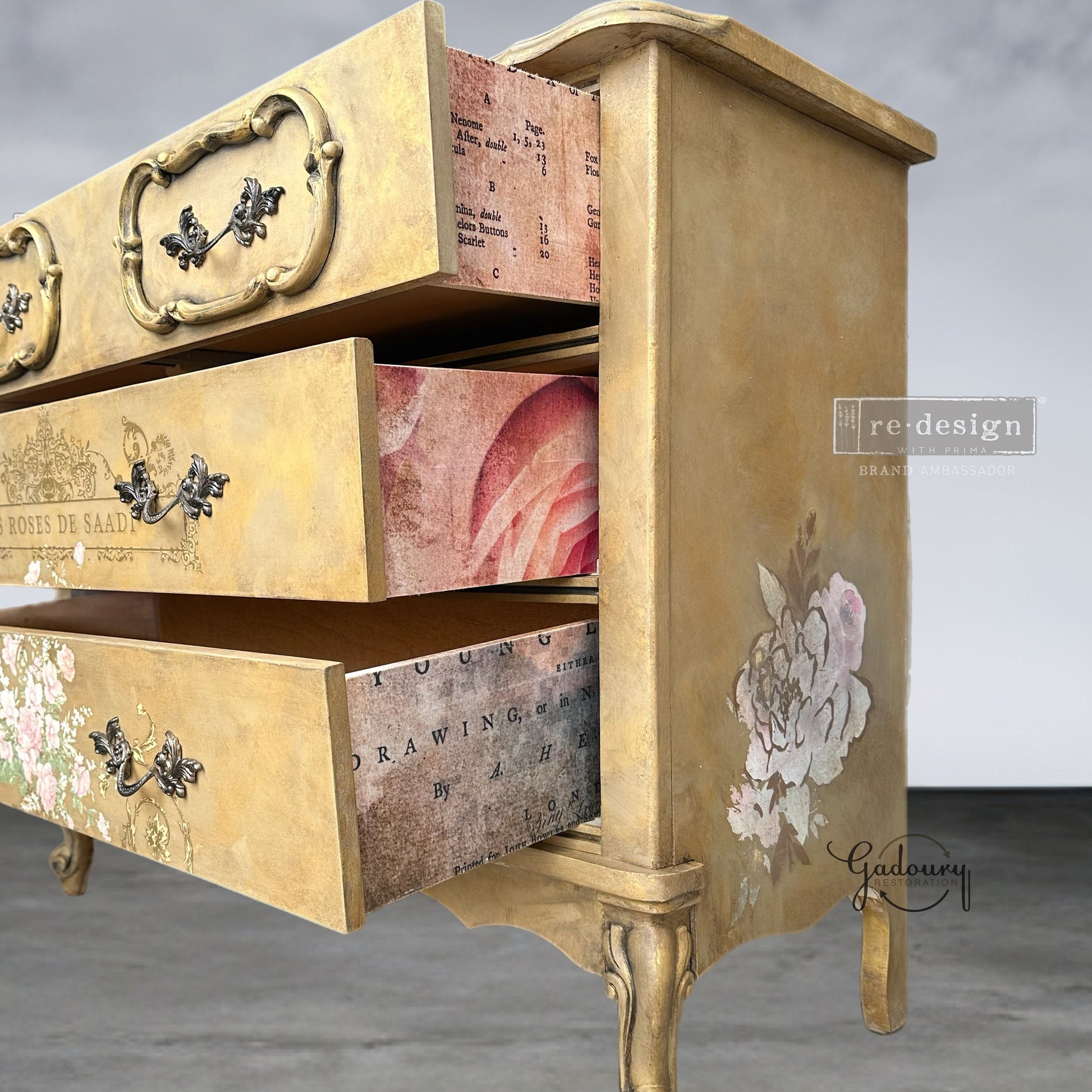 This gorgeous piece was painted in a muted green with gold added all over to create a wallpaper look effect. Glaze and antique wax added all over to give depth. Floral transfer added on the front and the sides. Original hardware with three drawers. Floral decoupage paper added on the sides of drawers! Such a pretty unique piece!